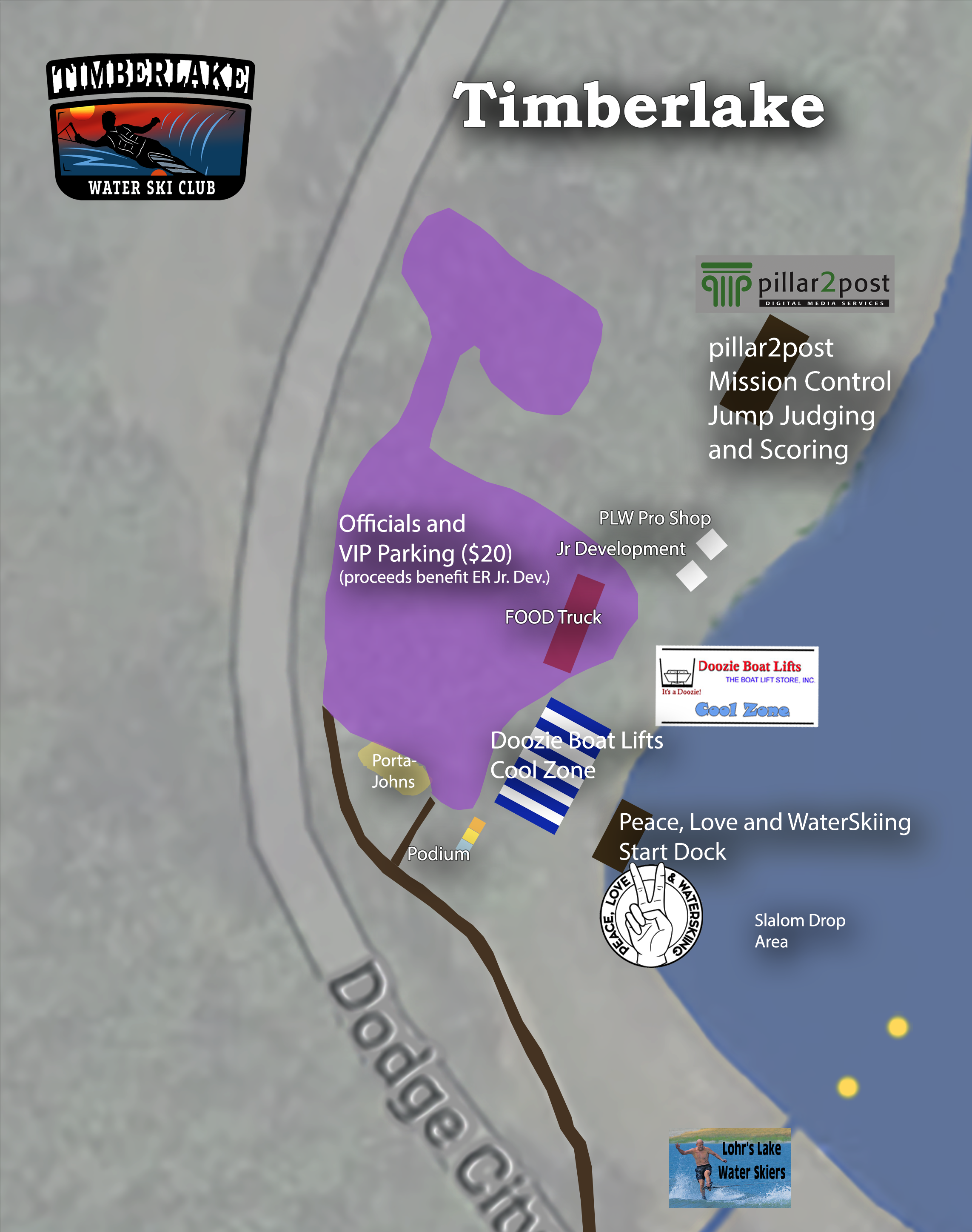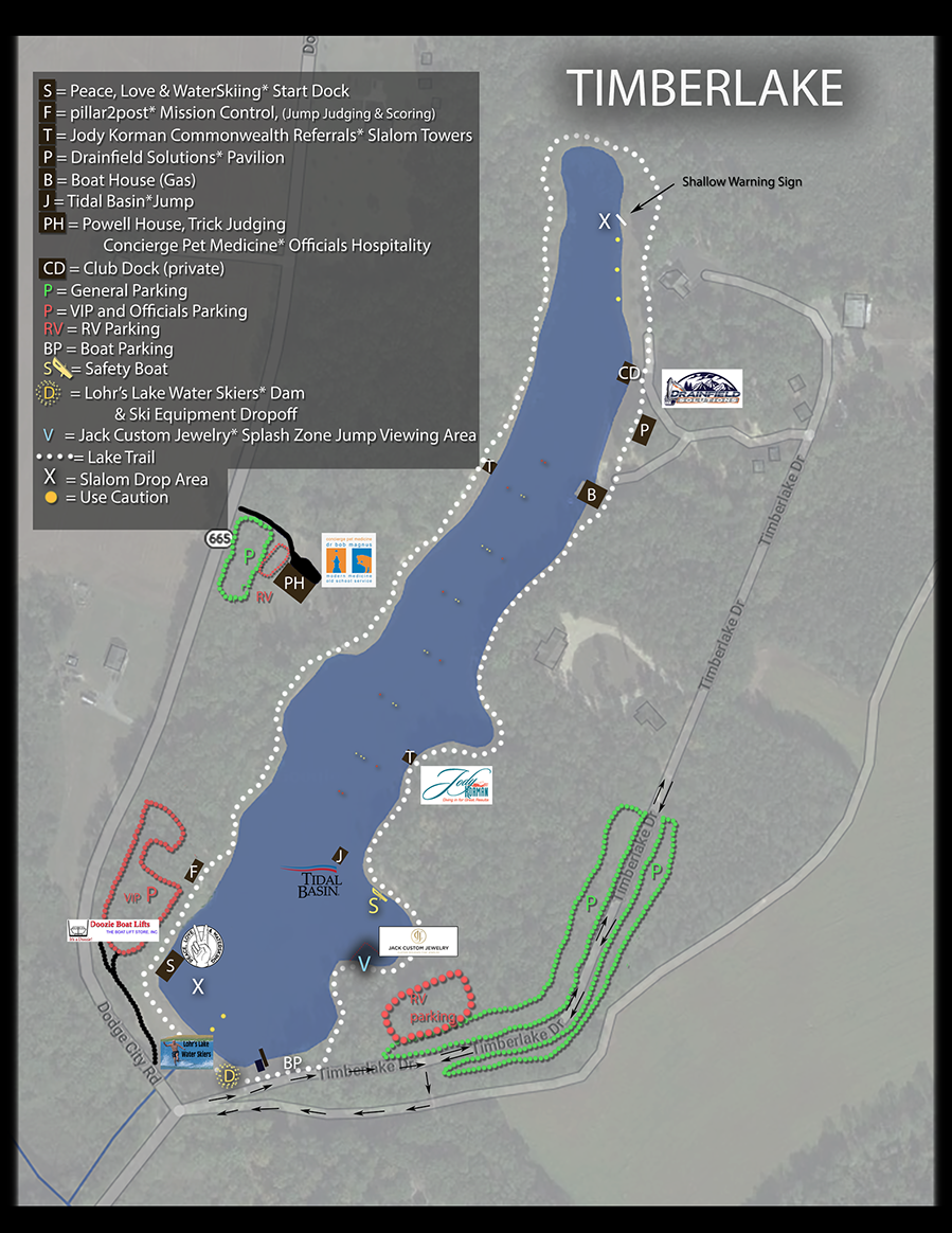 Plenty of Free parking is available on Timberlake Drive, with an Equipment drop-off area at the dam sponsored by Lohr's Lake Skiers.
